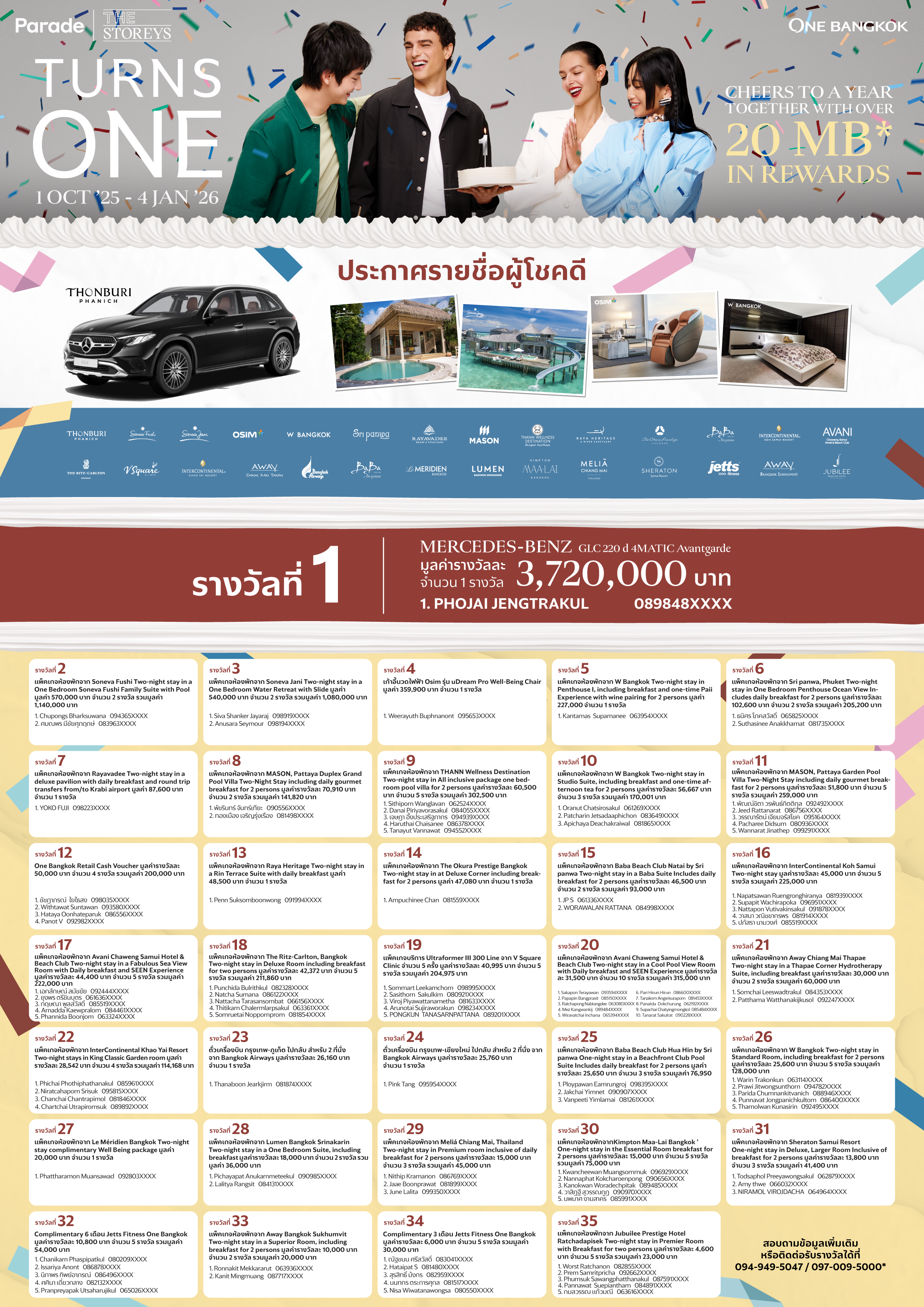 - ONE BANGKOK members must present the original receipt to redeem lucky draw rights at the Concierge Counter at G Floor, 1st Floor, 3rd Floor (Parade Zone), and G Floor (The Storeys Zone) from 10:00–22:00 hrs. (Redemption closes at 22:00 hrs. on 4 January 2026).