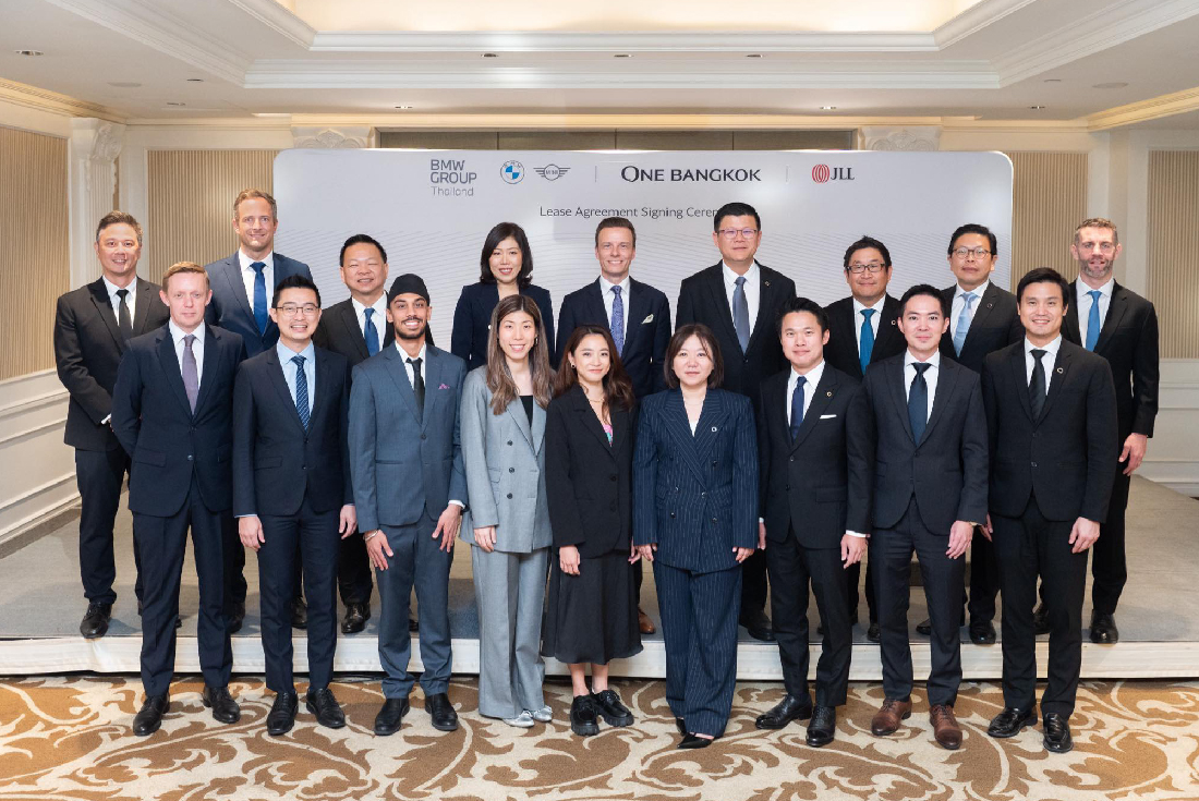 Lim Hua Tiong (4th from right), Chief Executive Officer of One Bangkok, recently signed a lease agreement with BMW Group Thailand, represented by Rene Gerhard (4th from left), President and CEO of BMW Group Thailand. The agreement secures office space at One Bangkok Tower 3 for BMW Group Thailand's new headquarters. The signing ceremony was attended by Jariya Koonlinthip (3rd from left), Chief Executive Officer of BMW Financial Services Thailand; Worawat Srisa-an (3rd from right), Deputy Chief Executive Officer of One Bangkok; Matthys De Kock (far left), Head of Real Estate Management – BMW Asia Pacific, Middle East, Africa; Tattayakorn Benjapattharaseth (2nd from right), Senior Vice President and Head of Office at One Bangkok; Preecha Ninatkiattikul (2nd from left), Director, Change Management and Special Projects, BMW Group Thailand and Michael Glancy (far right), Country Head of JLL Thailand.